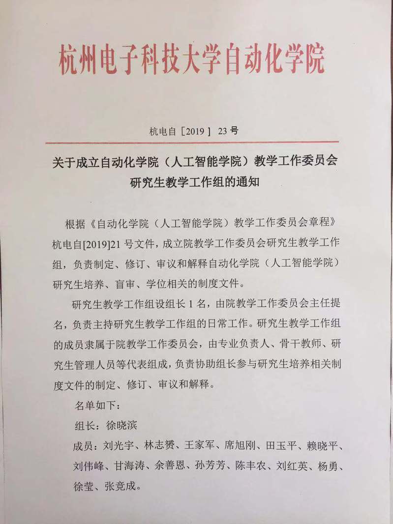 关于成立自动化学院(人工智能学院)教学工作委员会研究生教学工作组的通知